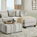 A combination of welting details and variance in textures adds a subtle hint of sophistication to this lovely corner sectional. Welt trims the inside of the arms, the edges of the box seat cushions, as well as the reversible pillow backs. On the throw pillows and matching ottoman, an assortment of patterns and materials create a sense of worldly personality; the lines of patterns blend in with the subdued hue of the base frame wrapped in beige chenille fabric.