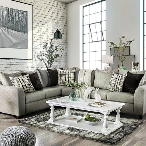 Kaylee Gray L-Shaped Sectional, 115 1/4"L X 68"W X 35 1/2"H, 208lbs. Features: U-Shaped Design Track Arms T-Cushion, Modular Design, Fitted Back Pi...